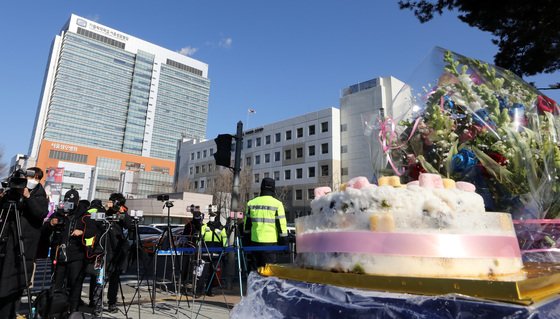 2일 서울 서초구 서울성모병원 앞에서 박근혜 전 대통령의 70번째 생일을 기념해 우리공화당 등 보수 지지층이 떡케이크를 차린 채 석방 촉구 집회를 하고 있다. 사진=뉴스1 |