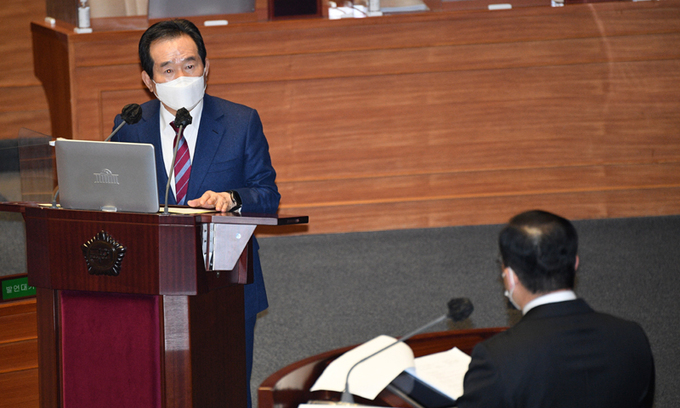 정세균 국무총리가 8일 서울 여의도 국회에서 열린 교육·사회·문화에 관한 대정부질문에 출석해 국민의힘 박성중 의원 질의에 답변하고 있다. 연합뉴스 |
