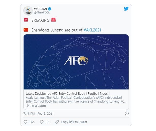 AFC는 8일(현지시간) "산둥이 AFC 클럽 라이선싱 규정을 어겨 2021시즌 AFC 챔피언스리그 참가 자격을 박탈한다"고 발표했다.