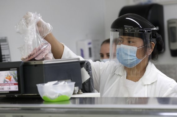 지난해 4월21일(현지시간) 미국 플로리다주 하이얼리아의 수퍼마켓에서 보호 장비를 갖춘 직원이 근무하고 있다.AP뉴시스 |