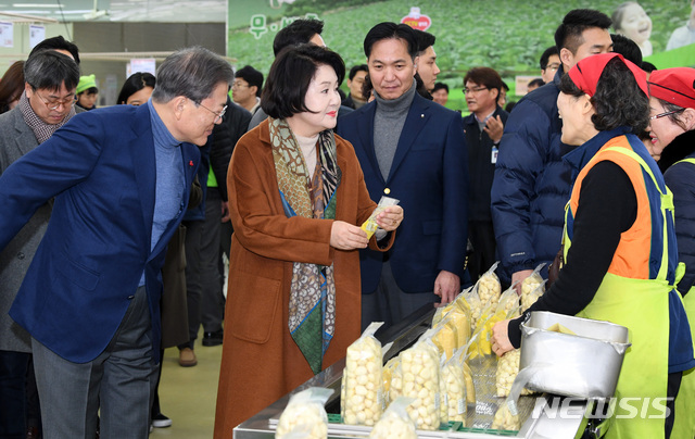 [서울=뉴시스박영태 기자 = 문재인 대통령과 김정숙 여사가 설 명절을 앞둔 23일 서울 서초구 양재동 농협 농수산물유통센터에서 장을 보고 있다. 2020.01.23. since1999@newsis.com |
