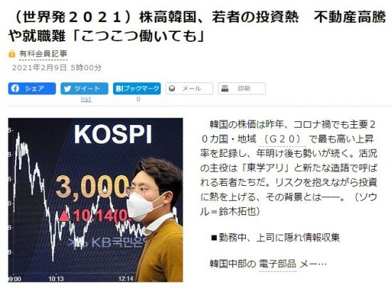 9일(현지시간) 올라온 일 매체 '아사히신문' 기사. 한국 주식 열풍과 이에 따른 '동학개미' 등 신조어 탄생에 대해 상세히 보도했다. / 사진=인터넷 홈페이지 캡처 |