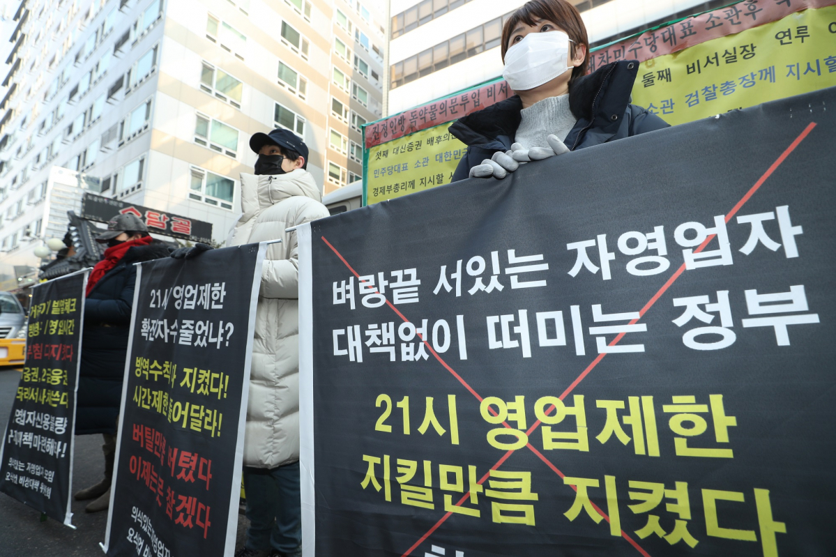 의식있는 자영업자모임 요식업비상대책위원회(음식점업 운영자모임) 관계자들이 12일 서울 여의도 더불어민주당사 앞에서 기자회견을 열고 자영업자 구제대책 마련, 시간제한 해제 등을 촉구하고 있다.(뉴시스) |