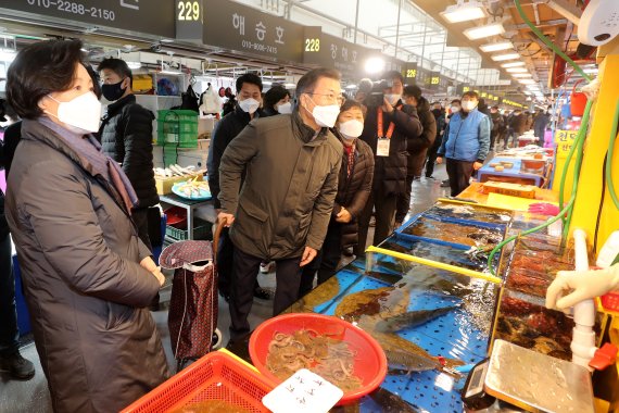 문 대통령 내외는 이날 인천 남동구에 있는 소래포구 전통어시장을 방문해 장보기를 했다.
