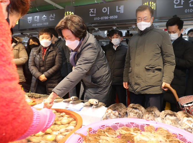 문 대통령 내외가 이날 오전 인천 남동구에 위치한 소래포구 전통어시장을 찾아 장을 보고 코로나19 속 시장 활성화를 위해 노력하는 상인들을 격려했다고 청와대가 전했다.