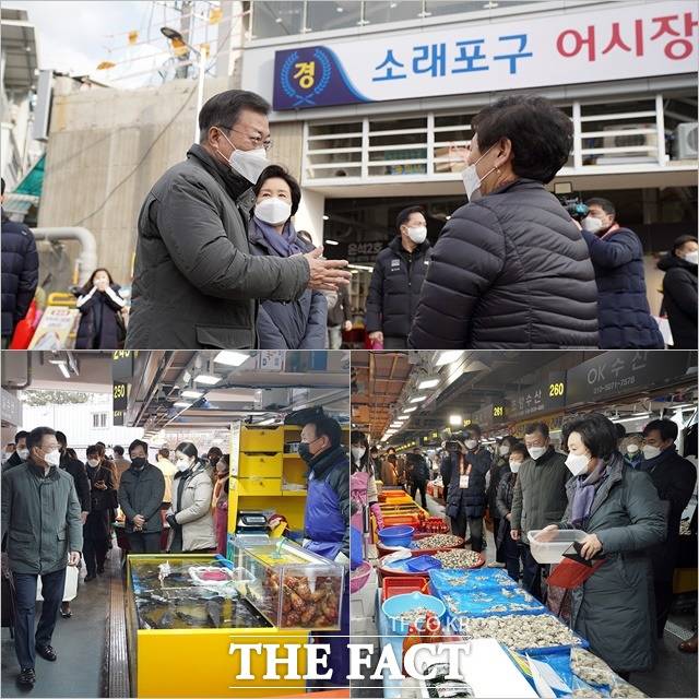 [더팩트ㅣ청와대=허주열 기자] 문재인 대통령과 김정숙 여사가 10일 오전 설을 앞두고 인천 남동구에 있는 소래포구 전통어시장을 방문해 직접 장을 보고, 코로나19 속에서 시장 활성화를 위해 노력하시는 상인들을 애로사항을 들었다.