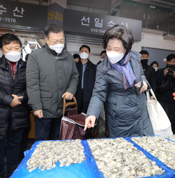 문재인 대통령과 부인 김정숙 여사가 10일 오전 인천시 남동구 소래포구 전통어시장을 방문, 상점에서 생굴을 구입하고 있다. (사진=연합뉴스) |