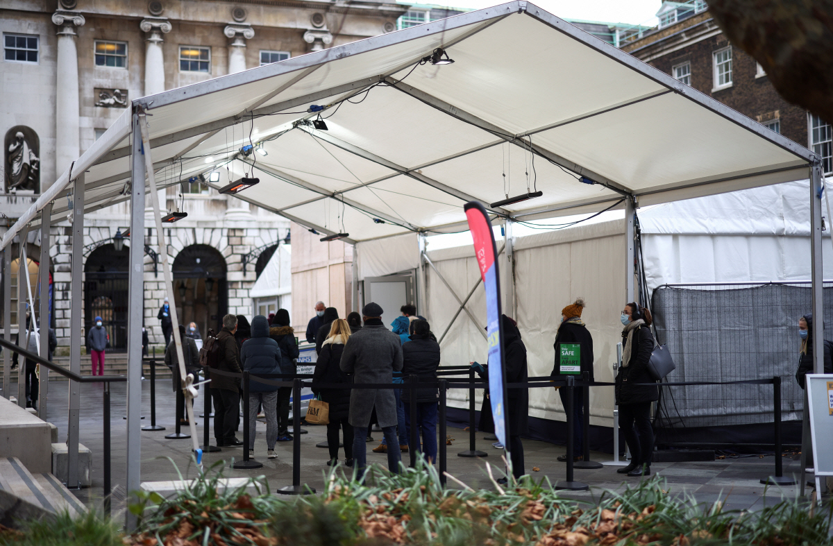 영국 런던 브리지 백신센터 앞에 시민들이 줄지어 서 있다. 런던/로이터연합뉴스 |
