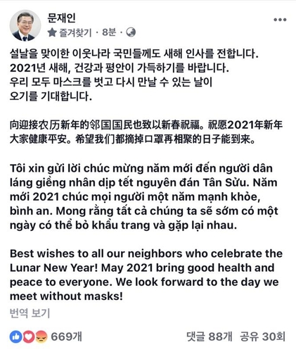 문 대통령은 사회관계망서비스(SNS)에 글을 올려 "설날을 맞이한 이웃나라 국민들께도 새해 인사를 전한다"며 "2021년 새해, 건강과 평안이 가득하기를 바란다. 우리 모두 마스크를 벗고 다시 만날 수 있는 날이 오기를 기대한다"고 밝혔다.