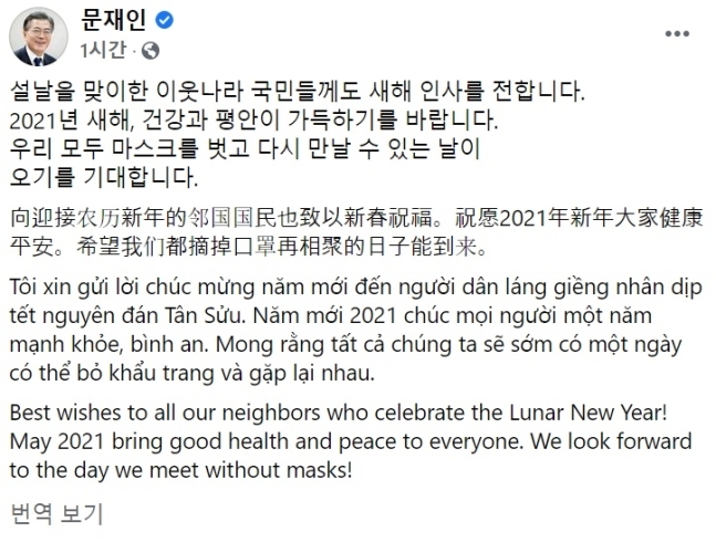 문 대통령은 SNS 메시지를 올려 "설날을 맞이한 이웃나라 국민들께도 새해 인사를 전한다"며 "2021년 새해, 건강과 평안이 가득하기를 바란다. 우리 모두 마스크를 벗고 다시 만날 수 있는 날이 오기를 기대한다"고 밝혔다.