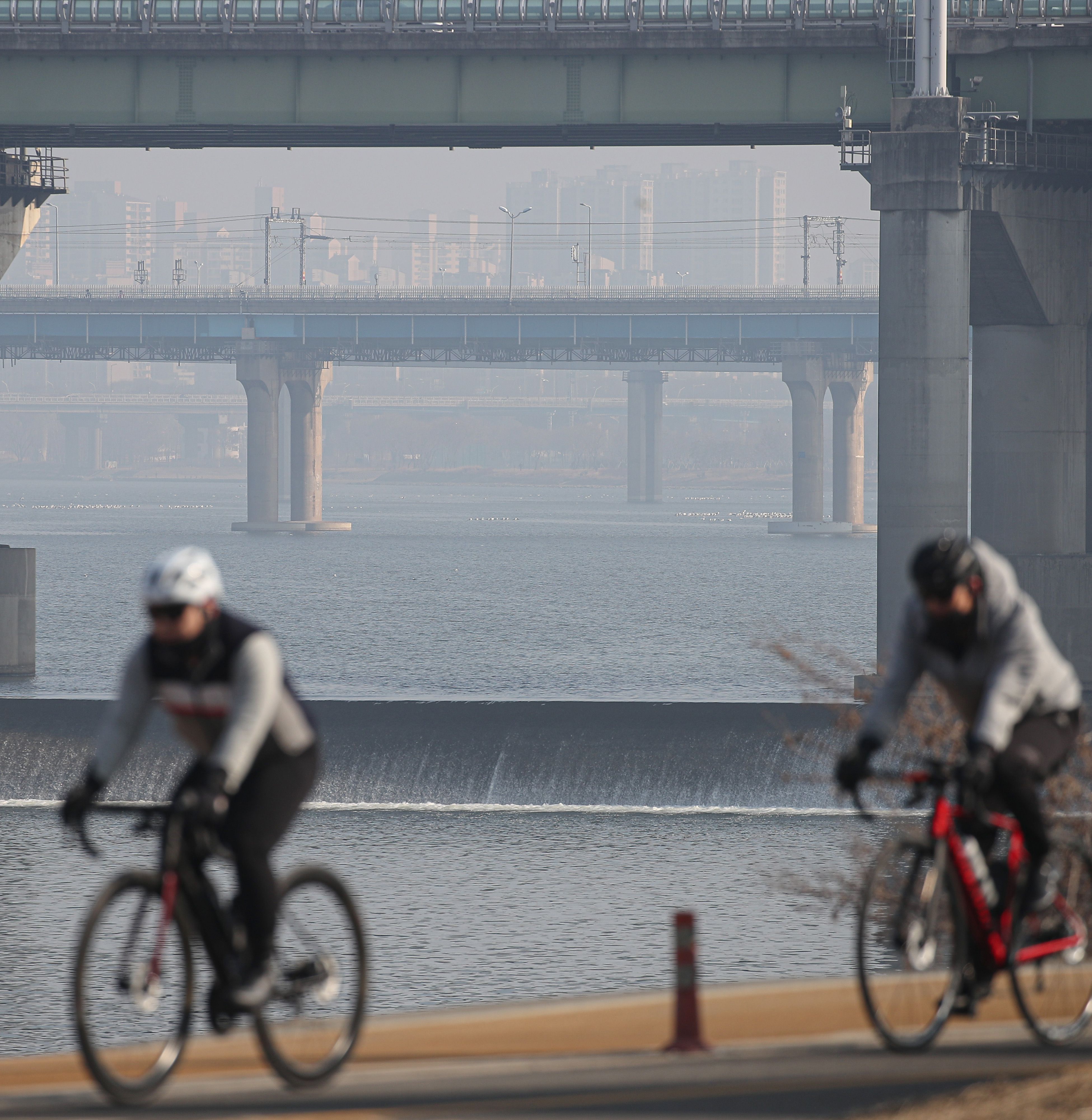 13일 오전 서울 송파구 잠실 한강시민공원에서 자전거를 타고 있는 시민들 뒤편으로 미세먼지가 뿌옇게 껴 있다. /연합뉴스 |