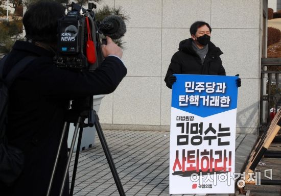김기현 국민의힘 탄핵거래 진상조사단 단장이 5일 서울 서초구 대법원 앞에서 김명수 대법원장의 사퇴를 촉구하는 1인 시위를 하고 있다. 탄핵 가능성을 언급하며 사표를 반려한 김명수 대법원장의 녹취가 공개되자 국민의힘은 김명수 탄핵 거래 진상조사단을 발족하기로 했다./김현민 기자 kimhyun81@ |