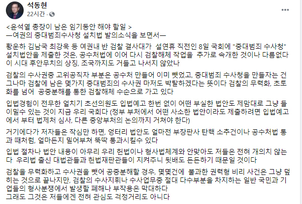 석 전 지검장은 "저들(여권)은 오직 자신들이 어떤 권세나 이권을 누려도, 그동안 자신들을 감시해온 검찰과 법원의 통제를 안 받고 혼날 일도 없는 세상을 만드는 것에만 신경쓸 뿐"이라며 "그것을 검찰개혁, 사법개혁이라 포장하고 있다"고 비판했다.
