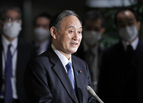 (도쿄 교도=연합뉴스) 스가 요시히데(菅義偉) 일본 총리가 12일 오후 일본 총리관저에서 신종 코로나바이러스 감염증(코로나19) 대책본부 회의가 끝난 후 기자들의 취재에 응하고 있다. |
