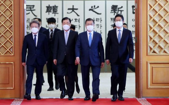 [아시아경제 이지은 기자] 문재인 대통령이 정의용 외교부 장관, 황희 문화체육관광부 장관, 권칠승 중소벤처기업부 장관 등 신임 국무위원들에게 임명장을 수여했다.