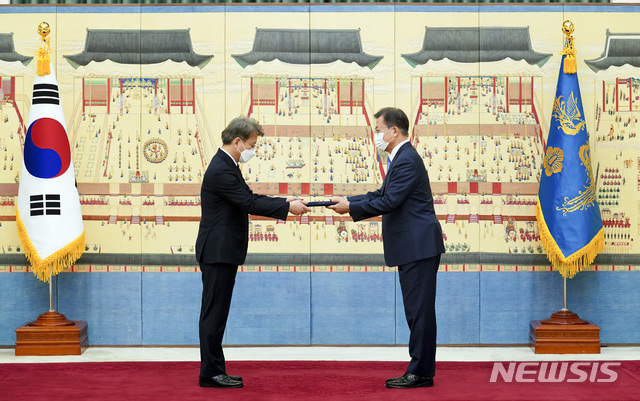 [서울=뉴시스]추상철 기자 = 문재인 대통령이 15일 오전 청와대 본관에서 권칠승 중소벤처기업부 장관에게 임명장을 수여하고 있다. 2021.02.15. scchoo@newsis.com |