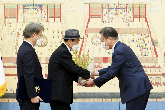 문재인 대통령이 15일 청와대에서 권칠승 중소벤처기업부 장관에게 임명장을 수여하고 함께 참석한 권 장관의 아버지에게 꽃다발을 전하고 있다.(사진=연합뉴스) |