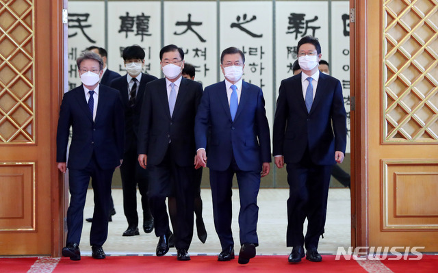 [서울=뉴시스]추상철 기자 = 문재인 대통령이 15일 오전 청와대 본관에서 열린 신임 국무위원 임명장 수여식을 마친후 신임 정의용 외교부 장관, 권칠승(왼쪽) 중소벤처기업부 장관, 황희(오른쪽) 문화체육관광부 장관과 함께 환담장으로 이동하고 있다. 2021.02.15. scchoo@newsis.com |