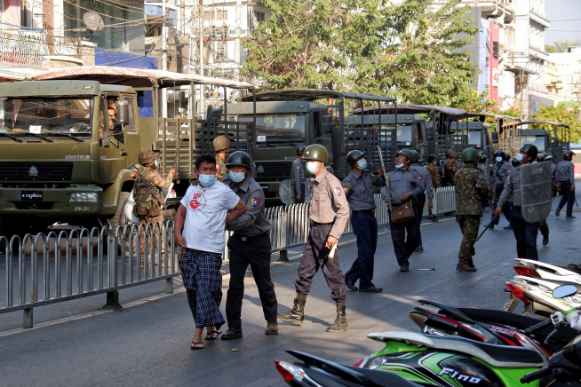 군부 쿠데타에 반대하는 시위가 네피도와 양곤, 만달레이 등 주요 도시에서 계속되고 있는 가운데 군부는 군 병력을 이동시키며 강경 진압을 예고했다. 양곤 시내 주요 도로에는 장갑차가 배치됐다. 시민들은 장갑차 주변에 모여 ‘우리는 쿠데타를 용인하지 않는다’는 구호가 적힌 플래카드를 들고 시위를 벌였다.