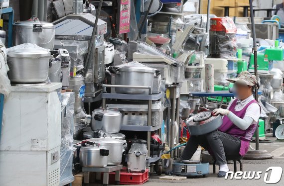 신종 코로나바이러스 감염증(코로나19) 사태로 자영업자의 폐업률이 늘고 있는 가운데 14일 서울 중구 황학동 주방거리 중고 주방용품점에서 한 상인이 물건을 정리하고 있다. 2020.9.14/뉴스1 © News1 임세영 기자 /사진=뉴스1 |