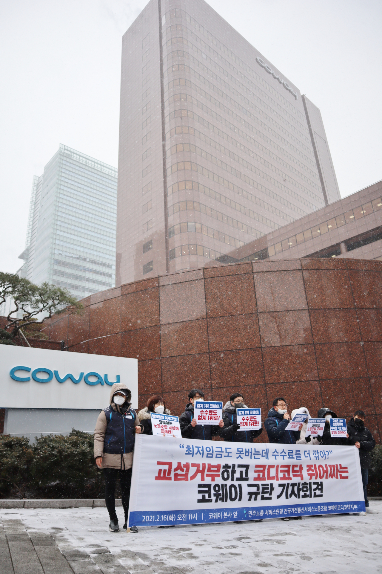전국가전통신서비스노조 코웨이 코디·코닥지부가 16일 오전 서울 코웨이 본사 앞에서 ‘교섭거부하고 코디코닥 쥐어짜는 코웨이 규탄’ 기자회견을 하고 있다. [전국가전통신서비스노조 코웨이 코디·코닥지부 제공] |