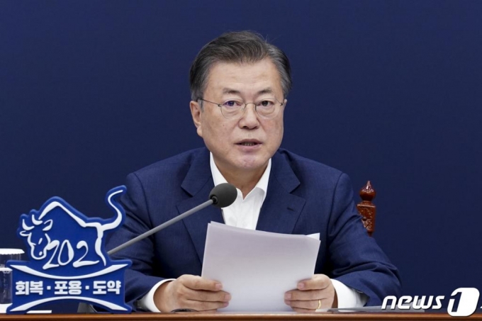 문재인 대통령이 16일 오후 청와대에서 화상회의 형식으로 열린 국토교통부 2021년 업무보고에 참석해 발언하고 있다./사진=뉴스1 |