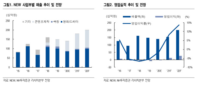 NH투자증권은 미개봉 영화를 여타 제작사와의 차별화 요인으로 언급했다. 최근 영화 ‘승리호’가 넷플릭스로 독점 공개되면서 글로벌 흥행에 성공했다. NEW는 넷플릭스로 영화 ‘콜’을 지난해 11월 공개했고 지난해 베니스영화제에 초청받았던 박훈정 감독 신작 ‘낙원의 밤’을 오는 4월 공개할 예정이다. 앞으로 미개봉 영화 4편의 OTT향 판매나 영화관 개봉은 추가 실적 성장의 기회 요인이 될 것으로 전망된다.