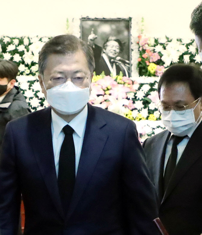 문재인 대통령이 17일 오전 서울 종로구 서울대학교병원 장례식장에 마련된 고 백기완 통일문제연구소장 빈소를 조문한 뒤 빈소를 나서고 있다.(사진=연합뉴스) |