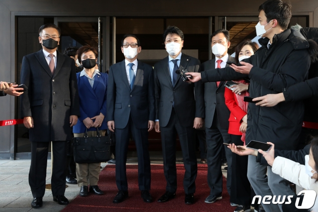 김도읍 의원 비롯한 국회 법제사법위원회 소속 국민의힘 의원들이 17일 오후 서울 서초구 대법원에서 김명수 대법원장과 면담을 마치고 취재진의 질문에 답하고 있다. 왼쪽부터 유상범, 조수진, 김도읍, 장제원, 윤한홍, 전주혜 국민의힘 의원. 국회 법제사법위원회 소속 국민의힘 의원들은 이날 김명수 대법원장에 대한 출석 요구가 더불어민주당의 반대로 무산되자 직접 대법원을 찾았다./사진=뉴스1 |