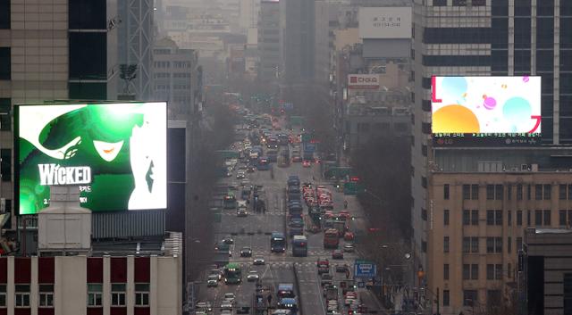 (서울=뉴스1) 사진은 미세먼지 농도가 나쁨 수준을 보인 15일 오전 서울 종로구 서울시교육청에서 바라본 광화문 네거리 모습. |