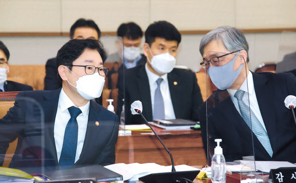 박범계 법무부 장관(왼쪽)과 최재형 감사원장이 18일 국회에서 열린 법제사법위원회 전체회의에서 대화하고 있다. 박 장관은 검찰인사를 놓고 신현수 청와대 민정수석과 갈등을 빚은 것으로 알려졌고, 최 원장은 월성원전 가동중단 및 경제성 평가와 관련한 산업통상자원부 감사로 논란을 불러왔다. 이상섭 기자 |