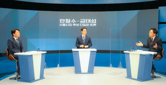 (서울=뉴스1) 국회사진취재단 = 서울시장 재보궐 선거에 출마한 국민의당 안철수 예비후보와 무소속 금태섭 예비후보가 18일 서울 마포구 채널에이 사옥에서 열린 단일화를 위한 토론을 하고 있다. 2021.2.18/뉴스1 /사진=뉴스1화상 |