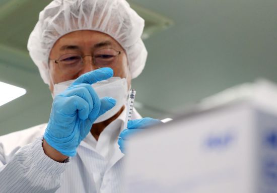 문재인 대통령이 18일 오후 전북 군산시 코로나19 백신접종용 최소잔여형(LDS) 주사기 생산시설인 풍림파마텍에서 주사기를 살펴보고 있다. [이미지출처=연합뉴스] |