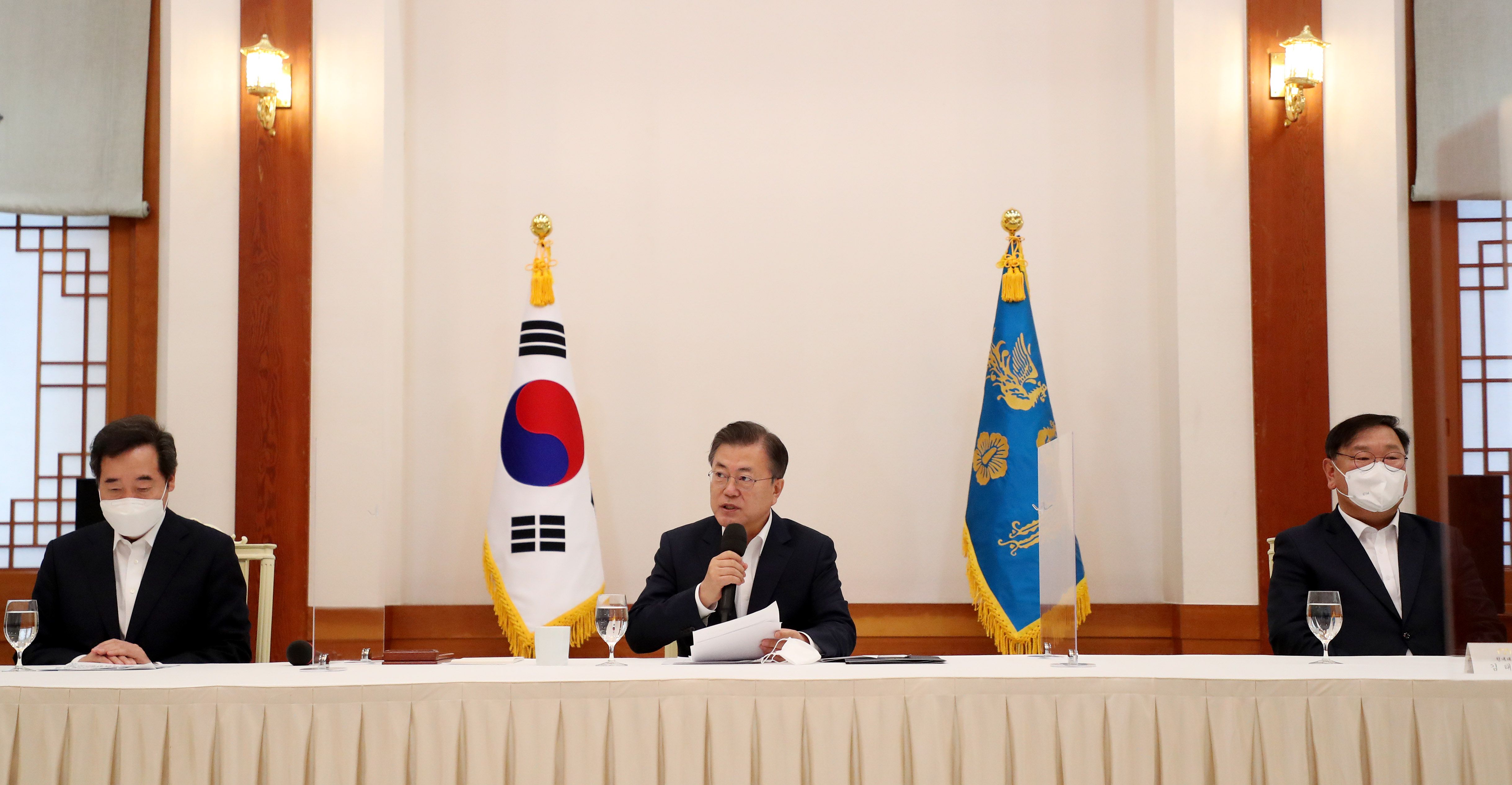 문재인 대통령이 19일 오전 청와대 본관에서 열린 더불어민주당 지도부 초청 간담회에서 인사말을 하고 있다. 문 대통령 왼쪽은 더불어민주당 이낙연 대표, 오른쪽은 김태년 원내대표. /연합뉴스 |