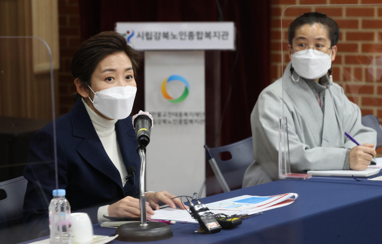 나경원 국민의힘 서울시장 예비후보가 18일 서울 강북구 시립 강북노인종합복지관을 찾아 사회복지사들과 간담회를 갖고 있다. [연합] |