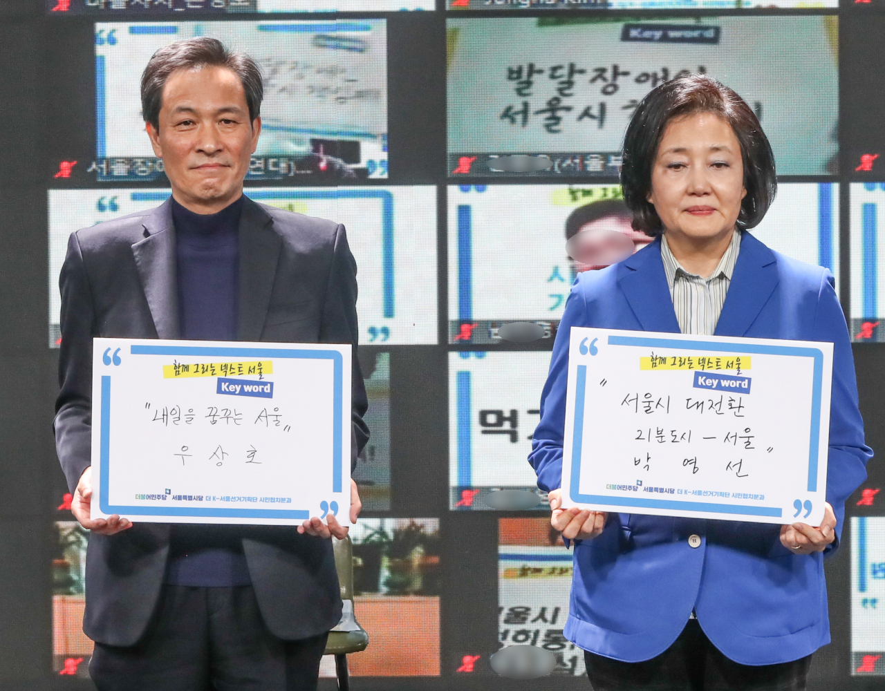 더불어민주당 우상호(왼쪽), 박영선 서울시장 예비후보가 20일 오후 서울 마포구 한 소극장에서 열린 민주당 서울시당의 '함께 그리는 넥스트 서울! 시민과의 대화' 행사에 나란히 참석했다. 연합뉴스 |