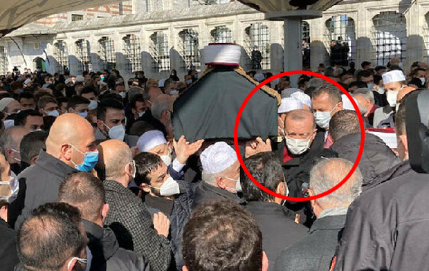 코로나19로 사망한 터키 이슬람학자 장례식에 조문객 수백 명이 몰렸다. 마스크는 착용했으나 거리두기는 실종된 모습이었다. 조문객 사이로는 레제프 타이이프 에르도안 터키 대통령도 눈에 띄었다./사진=예니샤파크 |