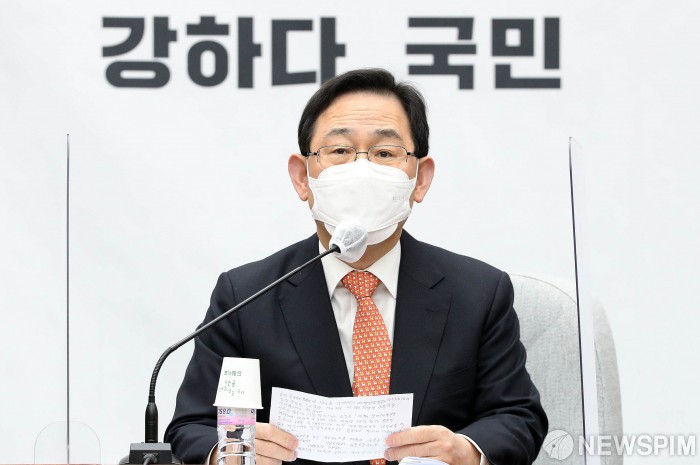 [서울=뉴스핌] 최상수 기자 = 주호영 국민의힘 원내대표가 23일 오전 서울 여의도 국회에서 열린 원내대책회의에서 모두발언을 하고 있다. 2021.02.23 kilroy023@newspim.com
