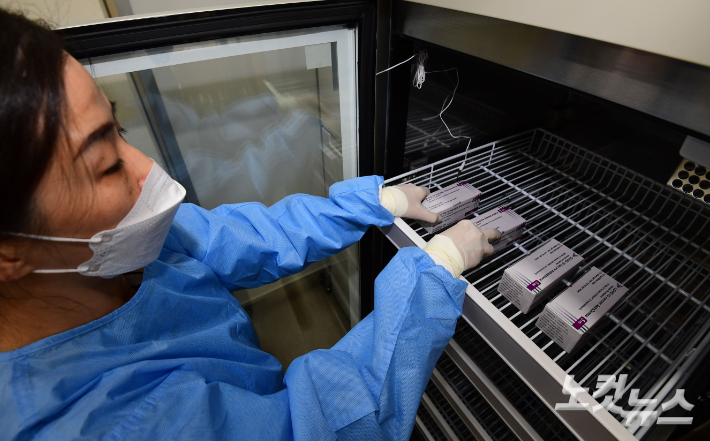아스트라제네카 백신이 25일 오전 서울 양천구보건소에서 도착, 보건소 관계자가 백신전용냉장고에 백신을 보관하고 있다. 황진환 기자 |
