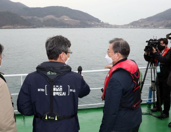 청와대는 "가덕도 인근으로 이동하면서 부산시장 권한대행으로부터 가덕신공항 추진 상황과 동남권 문화공동체 조성 방안에 대한 브리핑을 받았다"고 밝혔다.