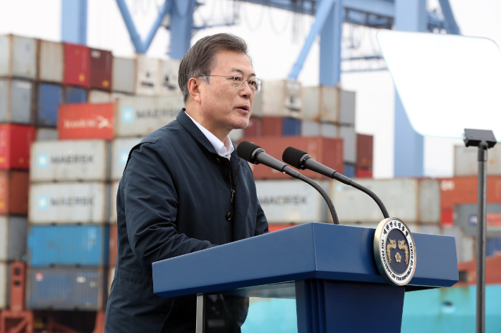 문재인 대통령이 25일 부산신항 다목적 부두에 위치한 해양대학교 실습선 선상에서 열린 '동남권 메가시티 구축 전략 보고'에서 발언하고 있다. 연합뉴스 |