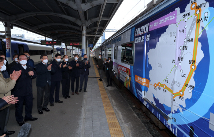 동남권 메가시티 보고에 ‘박수’ 문재인 대통령이 25일 부산 부전역에서 열린 ‘동남권 메가시티 구축전략 보고’ 행사에 참석해 동남권 광역철도 계획 등을 들은 뒤 박수를 치고 있다. 청와대사진기자단 |