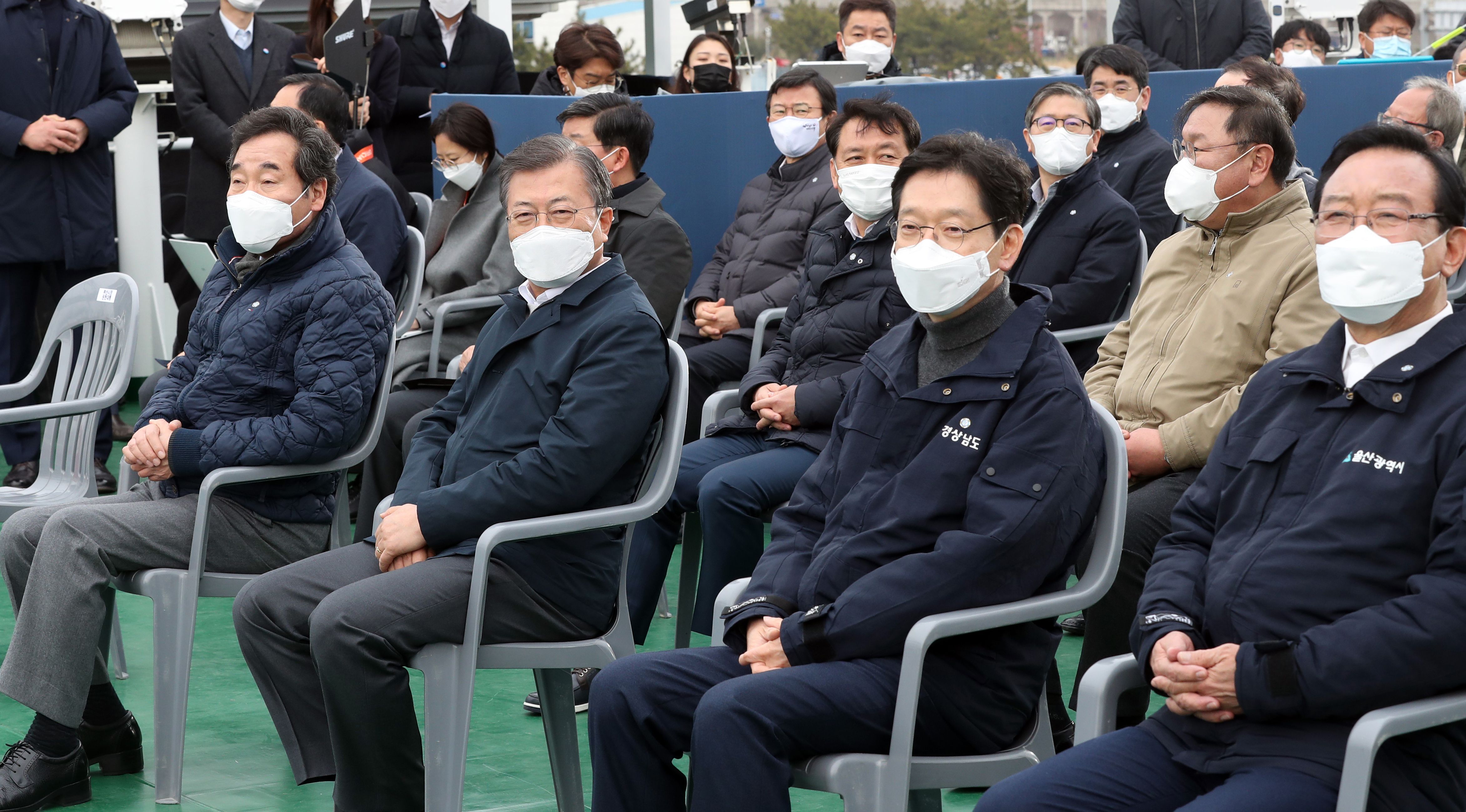 문 대통령은 전날 부산으로 내려가 ‘동남권 메가시티 구축 전략보고’ 행사에 참석한 뒤 부산 가덕도 신공항 부지를 방문했다. 이 행사 자리에는 더불어민주당 이낙연 대표와 김태년 원내대표, 홍남기 경제부총리, 전해철(행정안전부)·변창흠(국토교통부) 장관 등 당·정·청 핵심 인사 20여 명이 수행했다. 민주당 소속인 김경수 경남지사, 송철호 울산시장 등도 참석했다.