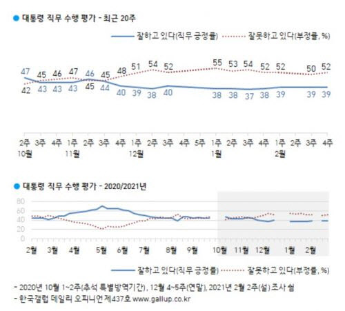 26일 여론조사 기관 한국갤럽에 따르면 ‘2월4주차 문 대통령의 직무수행 평가’는 긍정평가 39%, 부정평가 52%를 각각 기록했다. 긍정평가는 2월1주차부터 39%를 유지 중이고 부정 평가는 2%포인트 내렸다가 다시 2%포인트 상승했다.