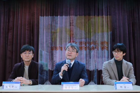 지난달 17일 서울 여의도 중앙보훈회관에서 열린 OTT음악저작권대책협의체 기자간담회에서 황경일 OTT 음악저작권대책협의체 의장(가운데)이 발언을 하고 있다. 사진=뉴시스 |