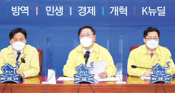 김태년 더불어민주당 원내대표(가운데)가 2일 국회에서 열린 원내대책회의에서 발언하고 있다. 이상섭 기자 |