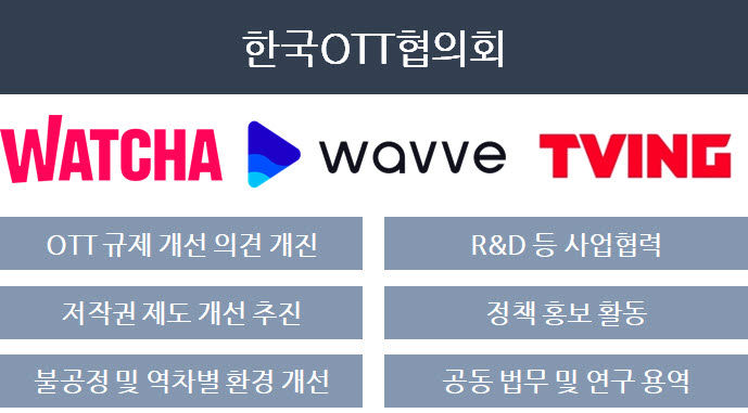 웨이브, 티빙, 왓챠는 온라인동영상서비스(OTT) 산업 성장에 따라 규제·제도 논의가 확산되는 상황에서 한국OTT협의회 발족에 합의했다. 정부가 입법을 통한 규제 강화에 나선 것이 연대를 강화하는 계기가 됐다.