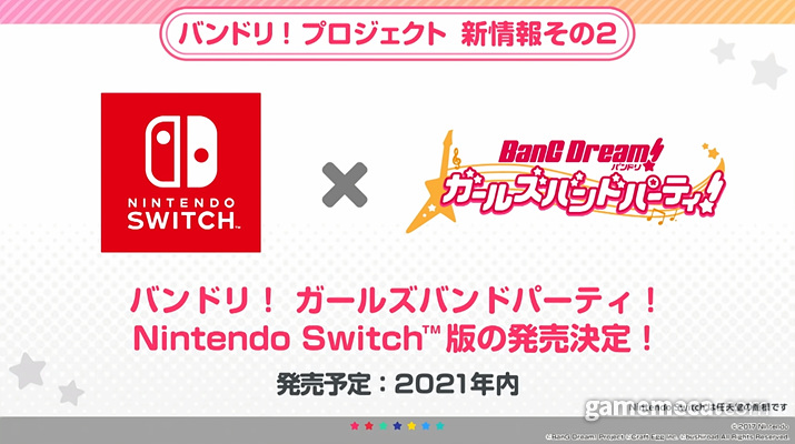 일본 미디어 회사이자 뱅드림 프로젝트를 총괄하고 있는 부시로드는 지난 1일, 뱅드림 프로젝트 6주년을 기념해 특별 방송을 진행했다. 해당 방송에서는 올해로 4주년을 맞는 뱅드림! 걸즈 밴드 파티!(이하 뱅드림)의 닌텐도 스위치 버전 출시가 공개됐다. 게임에 대한 구체적인 정보는 공개되지 않았으나, 2021년 연내 출시를 목표로 제작 중임이 밝혀졌다.