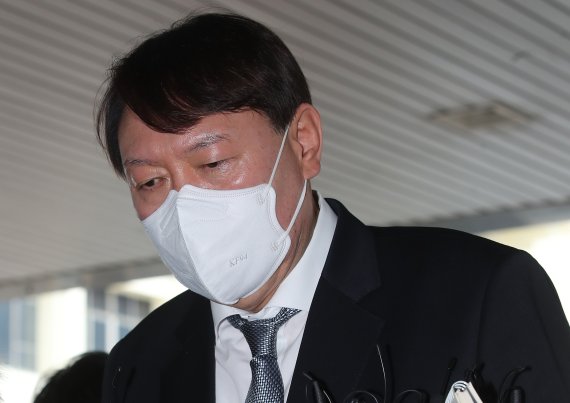 윤석열 검찰총장이 3일 오후 대구고등검찰청에 도착해 취재진의 질문에 답하고 있다. /뉴스1 |