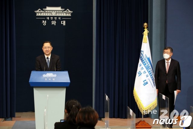 (서울=뉴스1) 이광호 기자 = 문재인 대통령이 4일 신현수 청와대 민정수석의 후임으로 김진국 감사원 감사위원을 임명했다. 이날 청와대 춘추관 브리핑룸에서 김진국 신임 민정수석이 인사말을 하고 있다. 오른쪽은 신현수 전 민정수석. 2021.3.4/뉴스1 |